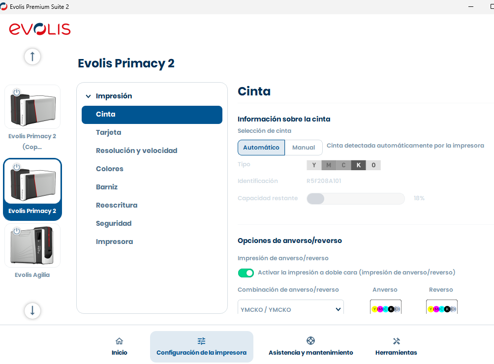 En 2026, las impresoras modernas como la Evolis Primacy 2 requieren cintas con chips originales. Si usas una cinta genérica, el equipo podría bloquearse o mostrar un error de «Consumible no compatible».